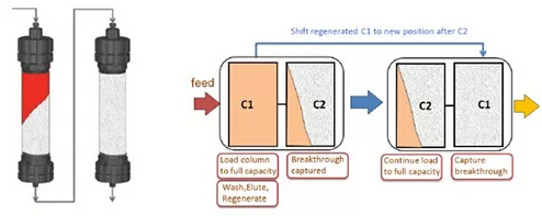 ? ? ? ?Capture SMB是將第一根層析柱的上樣流穿繼續(xù)上樣至第二根層析柱,待第一根層析柱完全滿載后,方結(jié)束其上樣,進(jìn)行淋洗、洗脫等操作,而此時(shí)第二根層析柱仍在繼續(xù)上樣。通過切換柱位操作,保證2根層析柱的洗脫、再生、上樣等操作交替銜接進(jìn)行,保證連續(xù)上樣,從而實(shí)現(xiàn)工藝與系統(tǒng)硬件設(shè)計(jì)的高度契合,使填料利用率最大化,用量大為縮減。