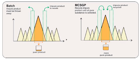 ? ? ?MCSGP工藝,可將含有不純組分的產品回收在一個封閉的環(huán)內,進行循環(huán)式的層析操作,從而最大限度地提取純產品,使得收率和純度二者兼得。