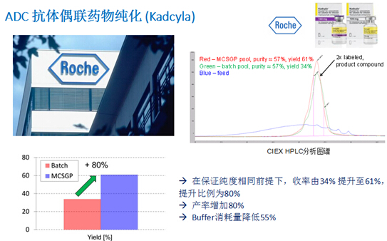 ? ? ??MCSGP(Multicolumn Countercurrent Solvent Gradient Purification)用于精純環(huán)節(jié),可有效克服SMB(模擬移動床)僅適用于二元分離、無法實現(xiàn)線性梯度的缺點。