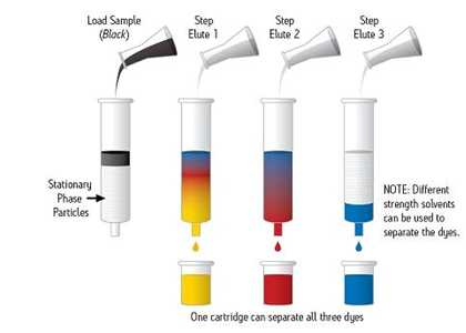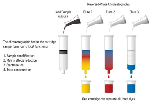 SPE通常是一種使用裝在柱芯型裝置內(nèi)的固體顆粒和色譜填充材料對樣品中的不同組分進(jìn)行化學(xué)分離的樣品制備技術(shù)。樣品幾乎始終呈液態(tài),但特殊應(yīng)用項(xiàng)目可能使用氣相中的某些樣品進(jìn)行。圖1顯示出一份樣品(圖示為黑色)正在使用SPE裝置進(jìn)行處理,以使組成該樣品的每種染色組分通過色譜分析實(shí)現(xiàn)分離。