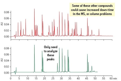 另一種考慮是存在于樣品基質(zhì)中的各種干擾物在每次進(jìn)樣時可能會蓄積導(dǎo)致儀器停機(jī)。如果這些干擾物能在樣品制備期間被除去,那么目標(biāo)化合物就能使用一種更簡單、更穩(wěn)定的方法進(jìn)行分析(圖3)。此圖將位于靠上位置的原始樣品與位于靠下位置的經(jīng)SPE制備后的新樣品進(jìn)行了比較。