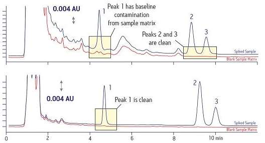 凈化樣品基質(zhì)所帶來的一個額外的優(yōu)勢是定量準(zhǔn)確度得以提高。圖4頂部所示的化合物1的藍(lán)色譜圖最初看起來似乎是可以接受的。然而,當(dāng)與其正下方用紅色顯示出的空白樣品基質(zhì)譜圖對比時可以發(fā)現(xiàn),其中的確存在源自樣品基質(zhì)中的某些污染物??肯碌淖V圖通過采用一種適當(dāng)?shù)腟PE試驗(yàn)方案而得出,表明同樣的化合物不存在干擾問題,從而使得定量準(zhǔn)確度顯著提高。