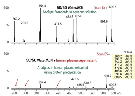 復(fù)雜樣品基質(zhì)帶來的第二種問題在我們觀察質(zhì)譜輸出圖譜(LC/MS或LC/MS/MS)時可以看到。為了獲得適當(dāng)?shù)馁|(zhì)譜響應(yīng)信號(靈敏度),必須使該化合物離子化。如果該化合物離子的形成因樣品基質(zhì)干擾物而受阻,那么相應(yīng)的信號強(qiáng)度也會大大減弱。