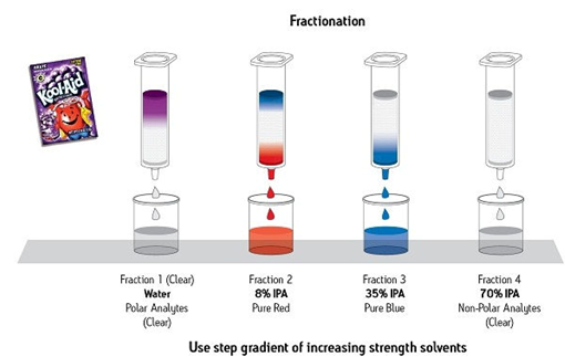 圖8給出了關(guān)于SPE分餾效力的一個示例。在這里,一種復(fù)雜的干粉樣品(紫葡萄混合飲品)被輕易分離成4種餾分:1種完全由極性化合物組成的餾分、1種純化型紅色化合物、1種純化型藍(lán)色化合物和1種包含所有其余非極性化合物的餾分。