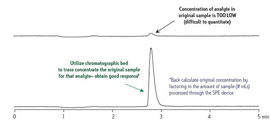 分析環(huán)境樣品中的痕量污染物或者代謝物在生物液體內(nèi)隨時間的變化情況就是一個可以說明這一點(diǎn)的較好例子。圖9中靠上的圖譜表明使用原始純樣品進(jìn)行分析時,目標(biāo)化合物的信號響應(yīng)差。通過以SPE作為痕量濃縮策略制備樣品后再使用相同的分析條件進(jìn)行分析后所獲得的靠下的圖譜表明這種化合物的信號強(qiáng)度顯著提高。根據(jù)這一結(jié)果,我們可以準(zhǔn)確計(jì)算出純樣品中的原始化合物濃度。
