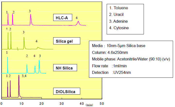 ????因此,對(duì)于極性化合物的洗脫,HILIC模式和反相模式是互補(bǔ)的。富士硅化學(xué)有限公司開(kāi)發(fā)了兩款HILIC模式的填料,命名為“HLC”硅膠。兩種HLC硅膠都含有兩性的官能團(tuán),共價(jià)鍵合在硅膠表面。“HLC-A”用于分離純化有機(jī)酸、核酸和糖類;“HLC-P”用于分離氨基酸、多肽。