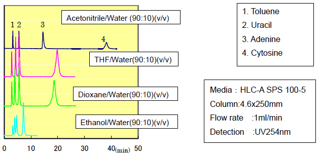乙腈、THF和二氧六環(huán)通常溶解在水中作為流動(dòng)相使用,而不會(huì)產(chǎn)生氫鍵相互作用。在高水相的條件下,洗脫時(shí)間變快。雖然反相體系常用于水溶性化合物的分離,但是HLC硅膠更適合用于極性化合物的分離。