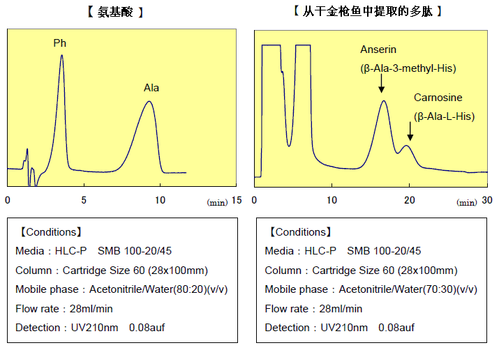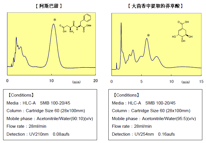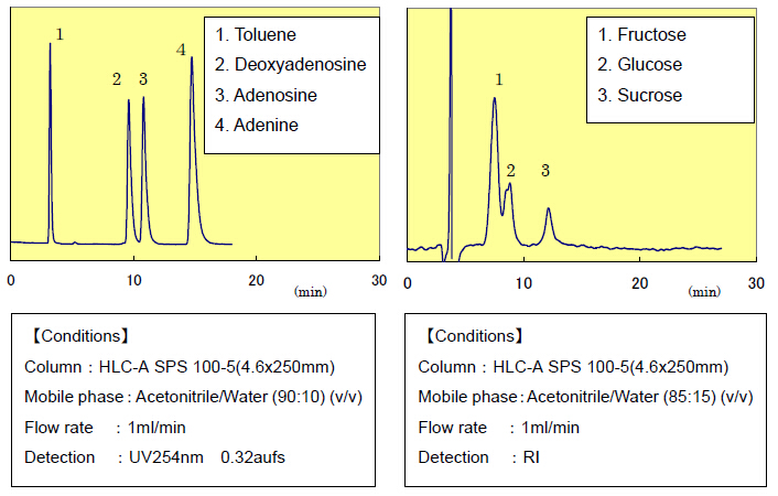 在HILIC模式下,初始流動(dòng)相條件用的是高比例有機(jī)溶劑和水。這種洗脫體系使得單一化合物得到分離,并且之后的處理步驟也相對(duì)簡(jiǎn)化(旋蒸或者凍干)。洗脫體系中水含量的增加,使得樣品更容易被洗脫出來(lái)。因此,在HILIC模式中,與水易混合的有機(jī)相體系最為常用,比如乙腈-水體系。以下應(yīng)用給出了使用HLC-A硅膠,在乙腈-水等度體系中,分析和制備的應(yīng)用。
