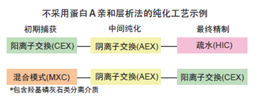 ??? 不采用蛋白A親和層析法的純化工藝可降低工藝成本。可通過(guò)結(jié)合使用陽(yáng)離子交換層析法 ( CEX ) 、陰離子交換 層析法 ( AEX )、疏水相互作用層析法 ( HIC ) 以及混合模式層析法 ( MXC ) 實(shí)現(xiàn)對(duì)單抗的高純度純化制備。