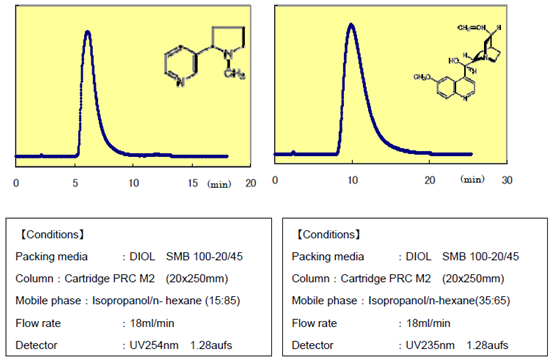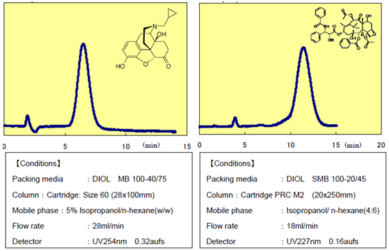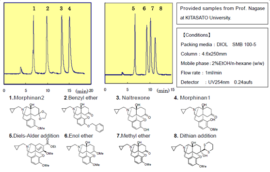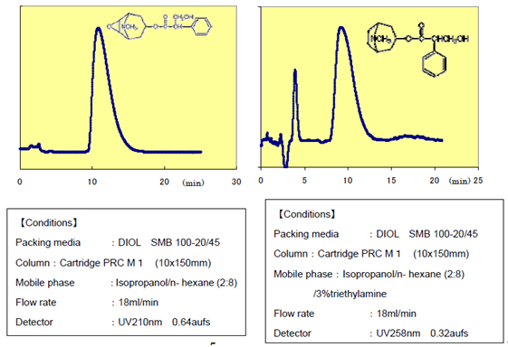 ?????? 富士公司經(jīng)過對二醇基硅膠的生產(chǎn)工藝和特性的研究,發(fā)現(xiàn)了普通硅膠在正相色譜中沒有的獨特性能。目前為止DIOL Silica已被廣泛用于分離有問題的化合物。