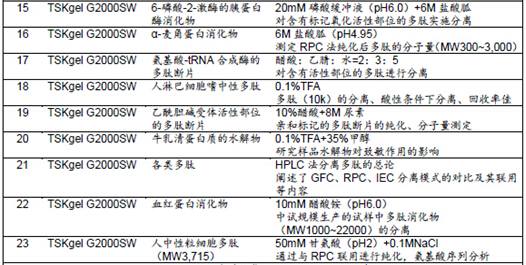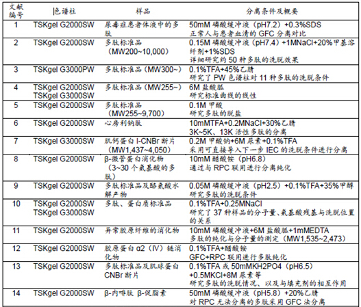 表1所示為TSKgel色譜柱在采用GFC法進行多肽分離的相關(guān)文獻及其概要。