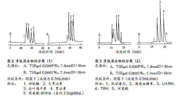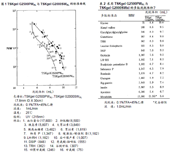一般情況下,采用GFC法分離多肽所使用的填充劑多為TSKgel的SW硅膠型填料而非TSKgel的PW樹脂型填料。本文中將針對這些填充劑(TSKgel G2000SWXL以及TSKgel G2500PWXL)在多肽分離的應(yīng)用上進行探討。
