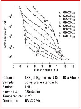 3. Hhr型色譜柱為常規(guī)的GPC色譜柱,尺寸為7.8mm ID×30cm。當(dāng)使用此類常規(guī)色譜柱時,大多數(shù)的HPLC系統(tǒng)無需進行針對柱外峰展效應(yīng)的優(yōu)化。