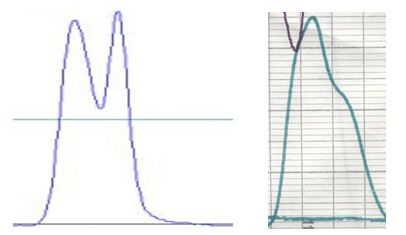 ? ? ? 可能原因:1)柱床中心凹陷,或柱床與篩網(wǎng)之間存有氣泡,導(dǎo)致樣品流動(dòng)不均勻(樣品需要繞過凹陷區(qū)或氣泡);2)裝填不均勻,甚至內(nèi)部有裂縫;3)篩網(wǎng)堵塞,導(dǎo)致樣品流動(dòng)不均勻;4)層析柱無分配器,或分配器設(shè)計(jì)不佳,導(dǎo)致偏流。