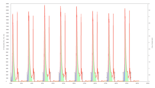 圖9各cycle重疊性良好,表明MCSGP功能運(yùn)行穩(wěn)定,各cycle的產(chǎn)率、產(chǎn)品濃度及純度均保持穩(wěn)定。保留時(shí)間和峰形的變化由MControl自動補(bǔ)償,MControl根據(jù)紫外線閾值啟動CBD收集,當(dāng)紫外值降低至最大峰值90%時(shí)結(jié)束收集。