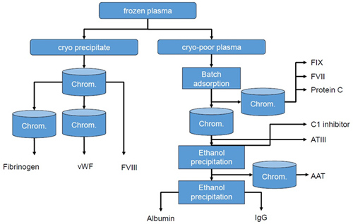 連續(xù)流層析可應(yīng)用于血液制品純化的多個階段,有效提高純化效率,改善收率和純度,詳見下圖: