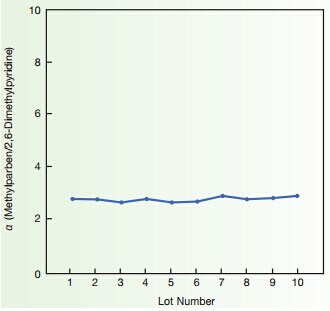 上圖所示,顯示了對羥基苯甲酸甲酯/2,6-二甲基吡啶(Methylparaben/2,6-Dimethylpyridine)在YMC-Pack ODS-AM液相色譜柱上10次的分離因子(α)。YMC公司在生產(chǎn)過程中采用的嚴格質(zhì)量控制體系,以保證產(chǎn)品生產(chǎn)批間的差異最小,提供高再現(xiàn)性的堿性化合物分析柱。